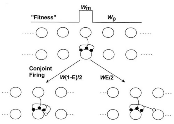 If the connections are composed of discrete synapses, and if Hebbian strengthening is a stochastic all-or-none process [24], then wi represents the probability that in a small time interval a synapse will "replicate" as a result of correlated activity across the connection to which it belongs. If the replication process is perfect, then the new synapse will appear at that connection. However, we assume that the new synapse is assigned to that connection only with probability (1-E), and that it can instead appear at either of the neighboring connections onto cells i-1 and i+1 (which may or may not already exist) with probability E/2. Although a synapse appears at a connection, which has a fitness wi, it is sometimes convenient to speak of it appearing at a neuron, and to refer to the fitness of that neuron (since it is awkward to speak of non-existent connections). E is the error rate for the formation of new synapses. Errors in the placement of new synapses could result from a combination of molecular noise in the signal cascades that underlie strengthening, and spread of messenger molecules beyond the synapse across which correlated activity occurs. Volume learning experiments [7,14,26] suggest that such errors may occur, although they have not been previously interpreted as such, and do not provide direct evidence for the formation of new connections. Other work [3,8,12] suggests that new connections form in the vicinity of existing connections, by a sprouting process, but has not determined the causes.