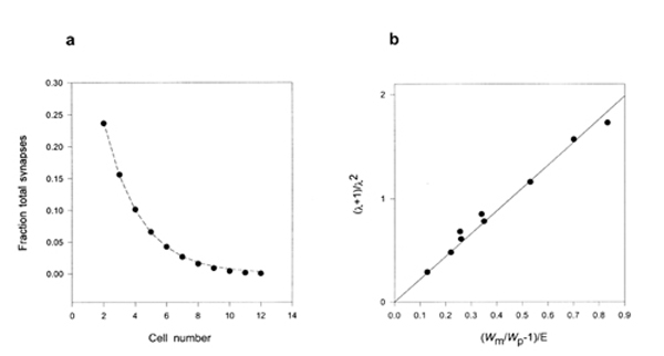 Fig 3. Part a shows the fraction of the total number of synapses (13,000) that form at less fit connections (i.e. the plateau region) compared to an exponential curve of length constant 8 = 2.45 neurons). E = 0.2; wm/wp = 1.05. Cell 13 received no synapses and was omitted. Part b shows the reciprocal effects of relative fitness and error rate. Each point was obtained for a different combination of wm/wp and E from data like that shown in part a. The linear regression through the origin has a slope of 2.2, compared to the predicted slope 2.0 (see Methods Eq.10).